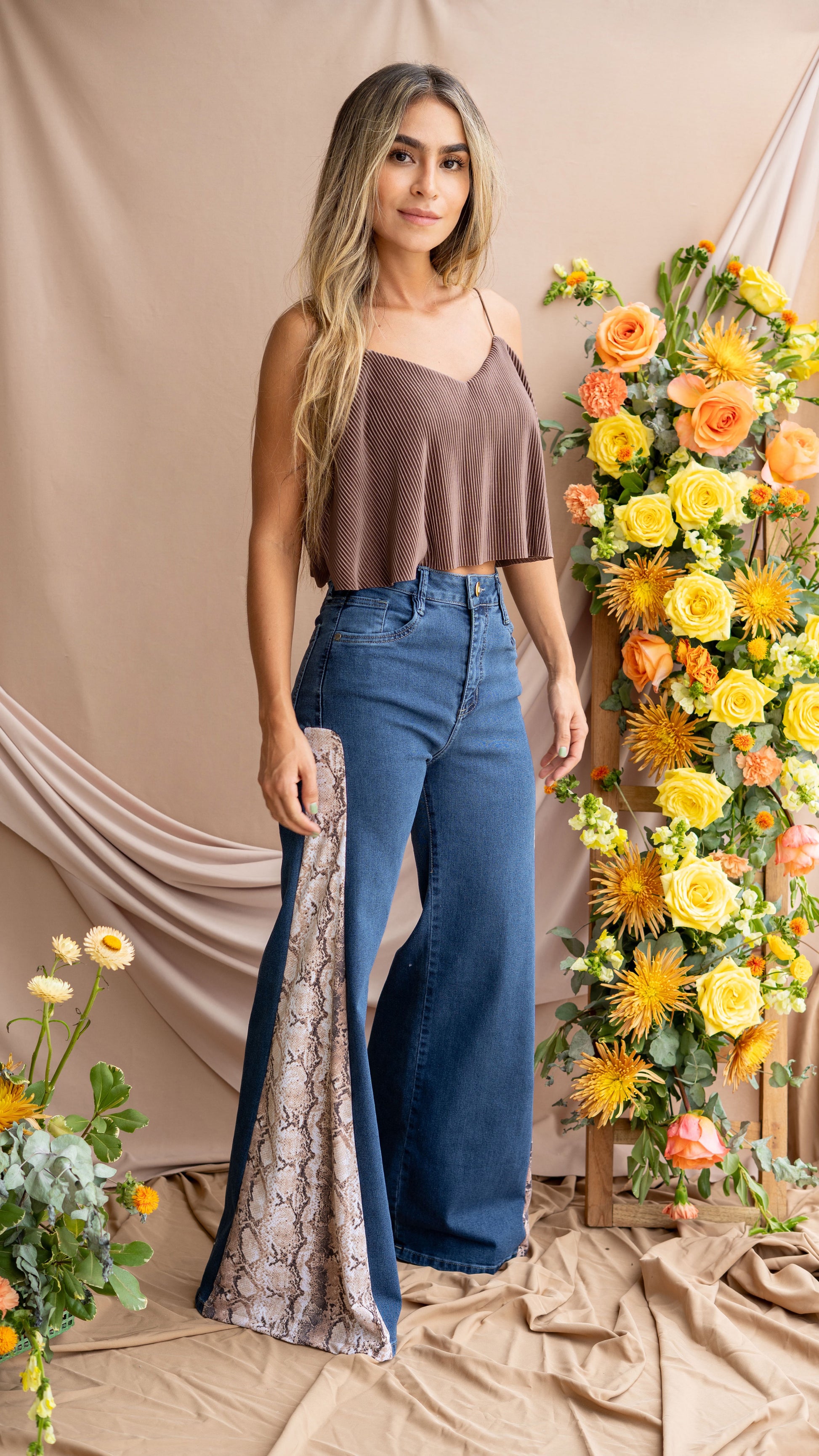 Jeans con stretch e intervención en tela de animal print "culebra". Se recomienda pedir una talla más de la habitual. Una prenda que resalta tu figura y proyecta fuerza femenina.